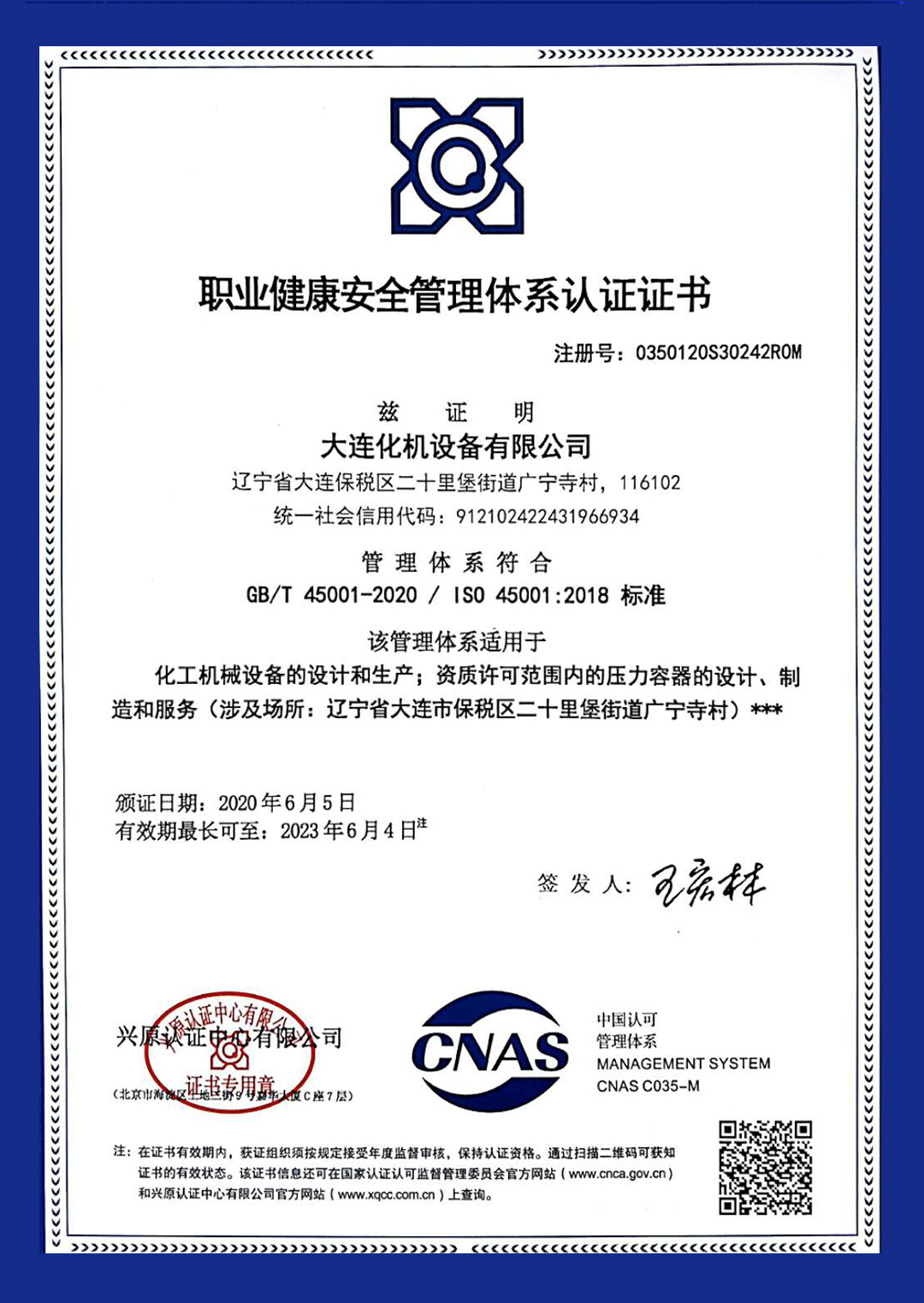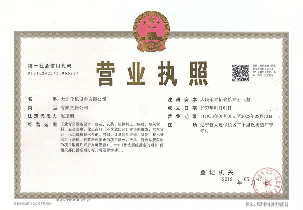 大连化机设备有限公司压力容器生产许可证(2020年)