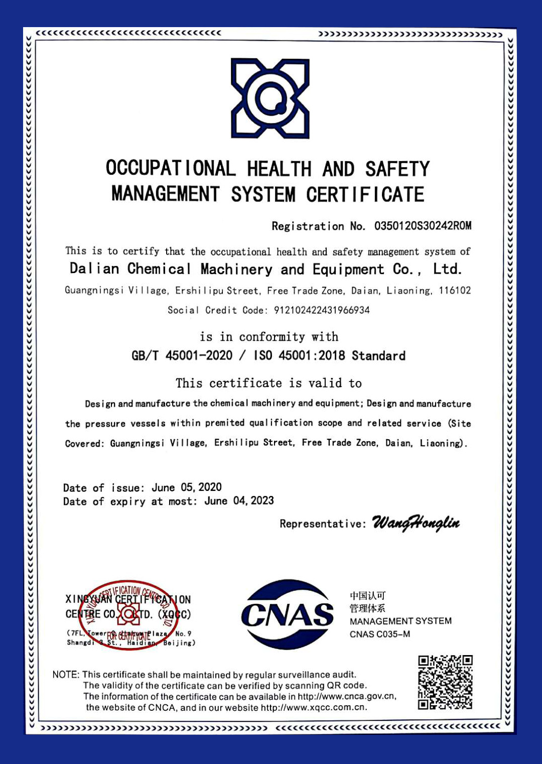 职业健康安全管理体系认证证书(中文)
